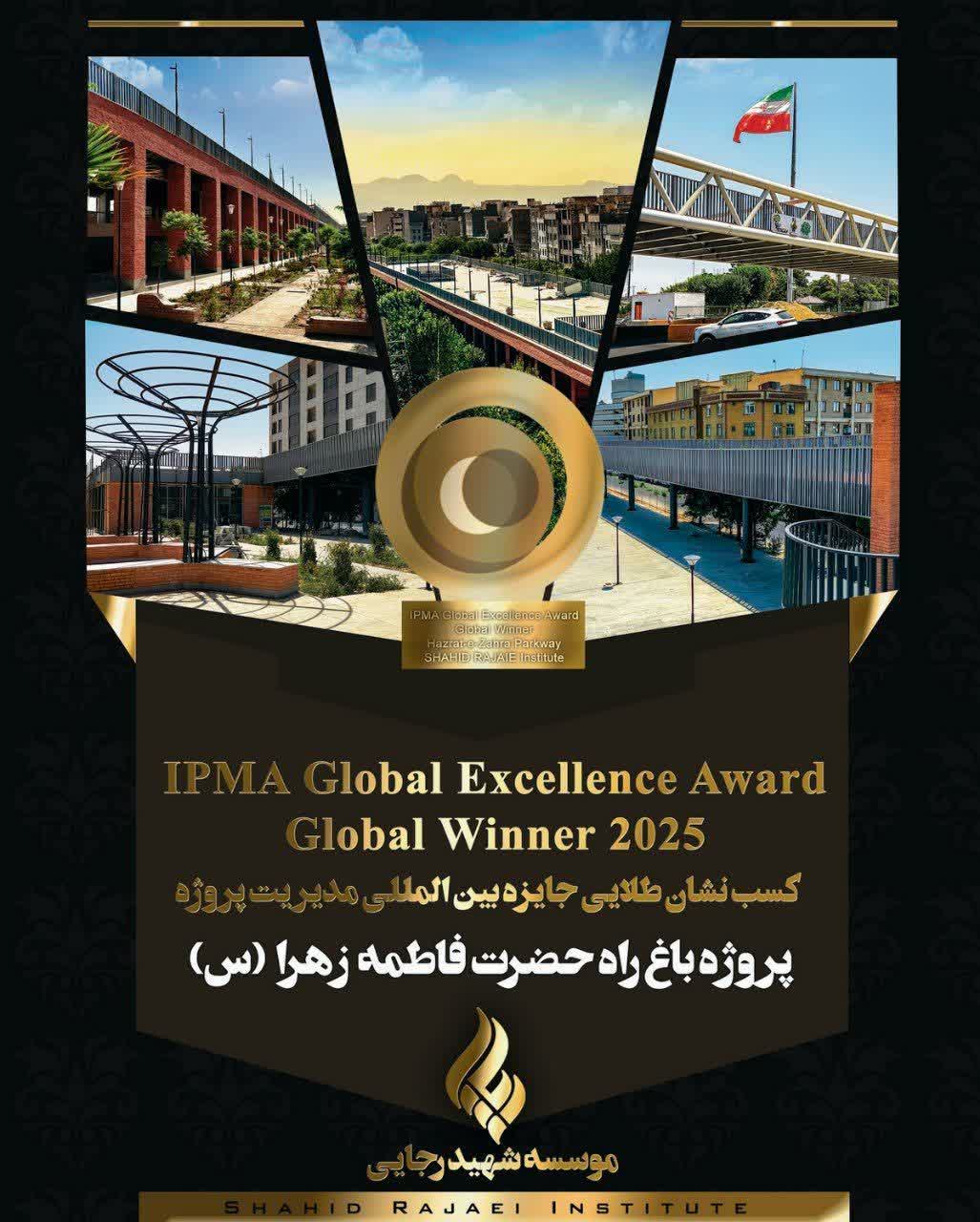 به گزارش طلوع پرس به نقل از روابط عمومی قرارگاه سازندگی خاتم‌الانبیاء(ص)، پروژه «باغ‌راه حضرت فاطمه زهرا(س)» از مجموعه طرح‌های موسسه شهید رجایی هلدینگ راه و شهرسازی قرارگاه سازندگی خاتم‌الانبیاء(ص) موفق شد در رقابت‌های معتبر IPMA Global Project Excellence Award 2025، تندیس طلایی این رویداد جهانی را به دست آورد.